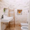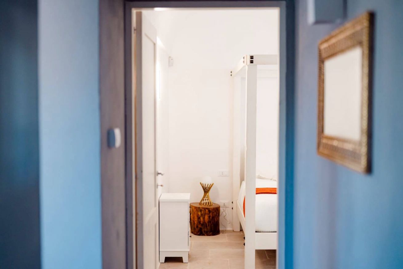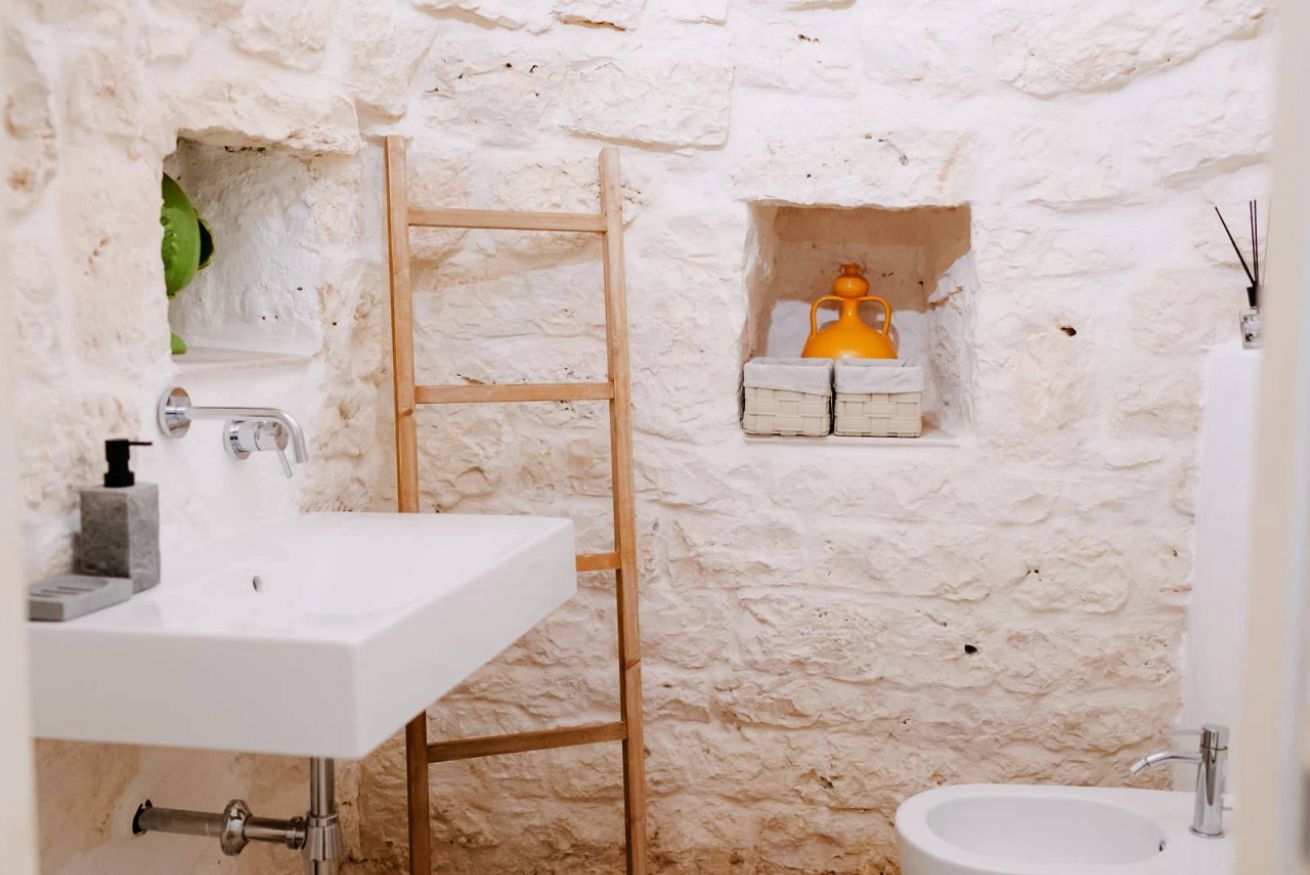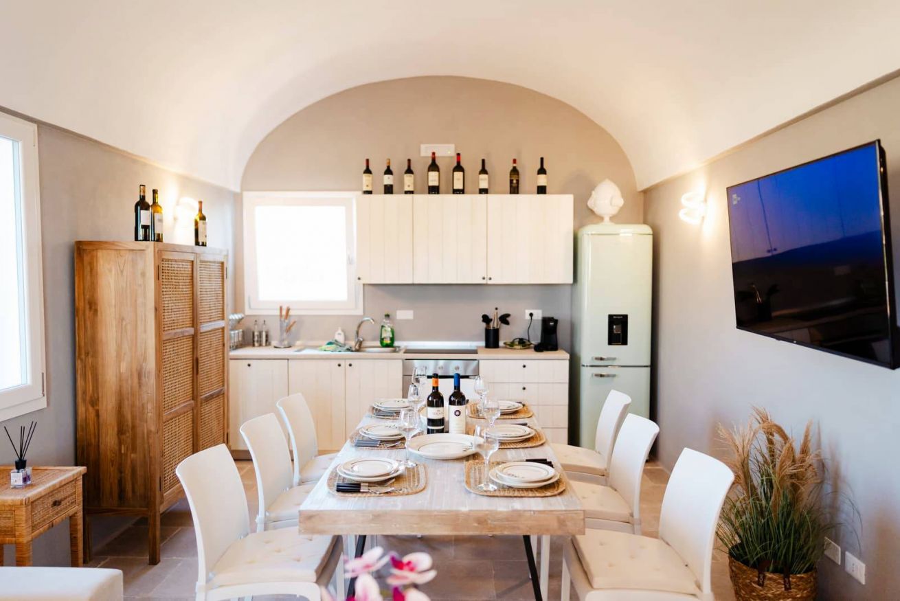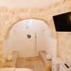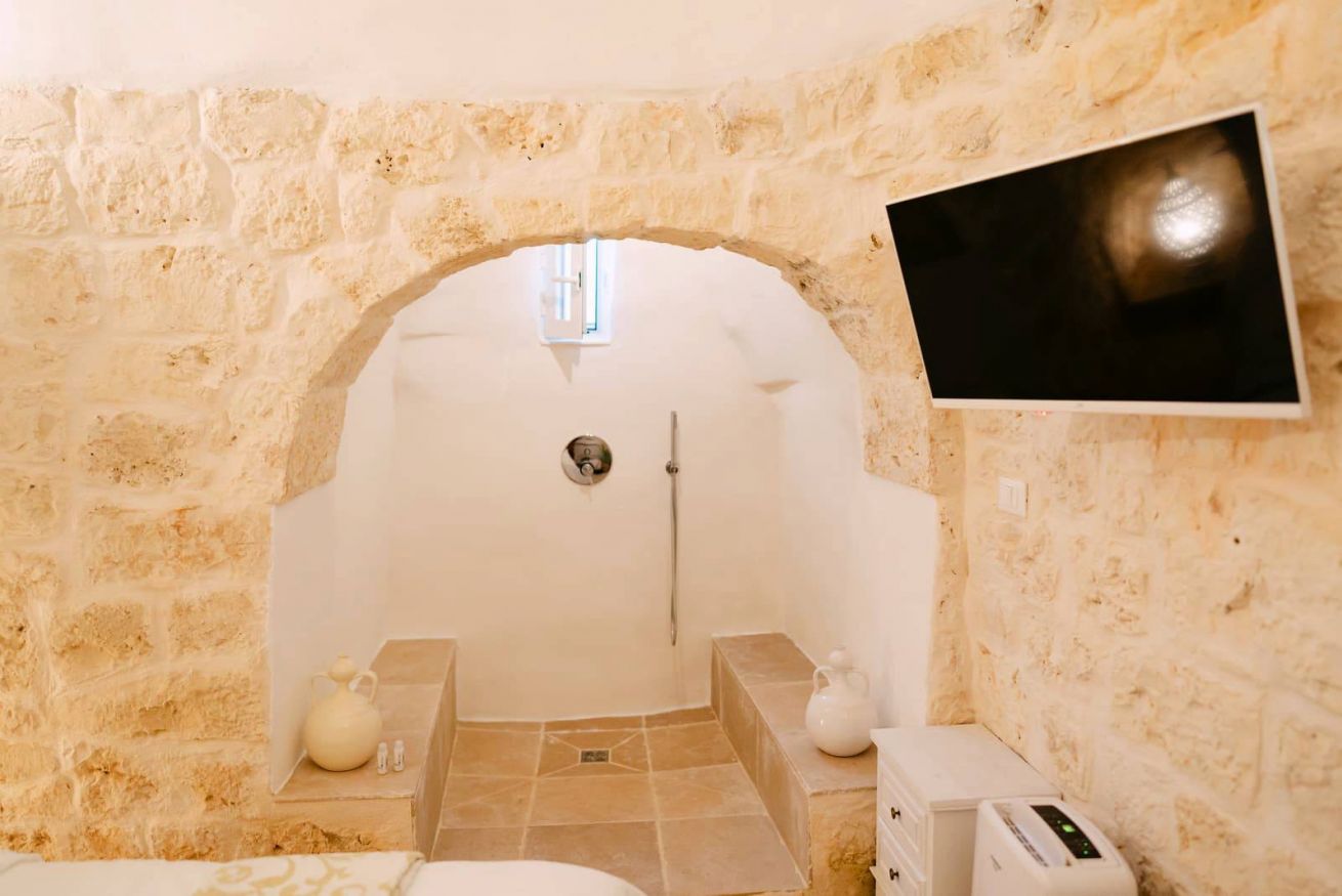 Piano Terra: ingresso nella zona living con cucina attrezzata, dalla quale si accede a due camere matrimoniali con letto king-size, entrambe con bagno en suite con doccia. Trullo adiacente con camera matrimoniale, doccia a vista e bagno.
