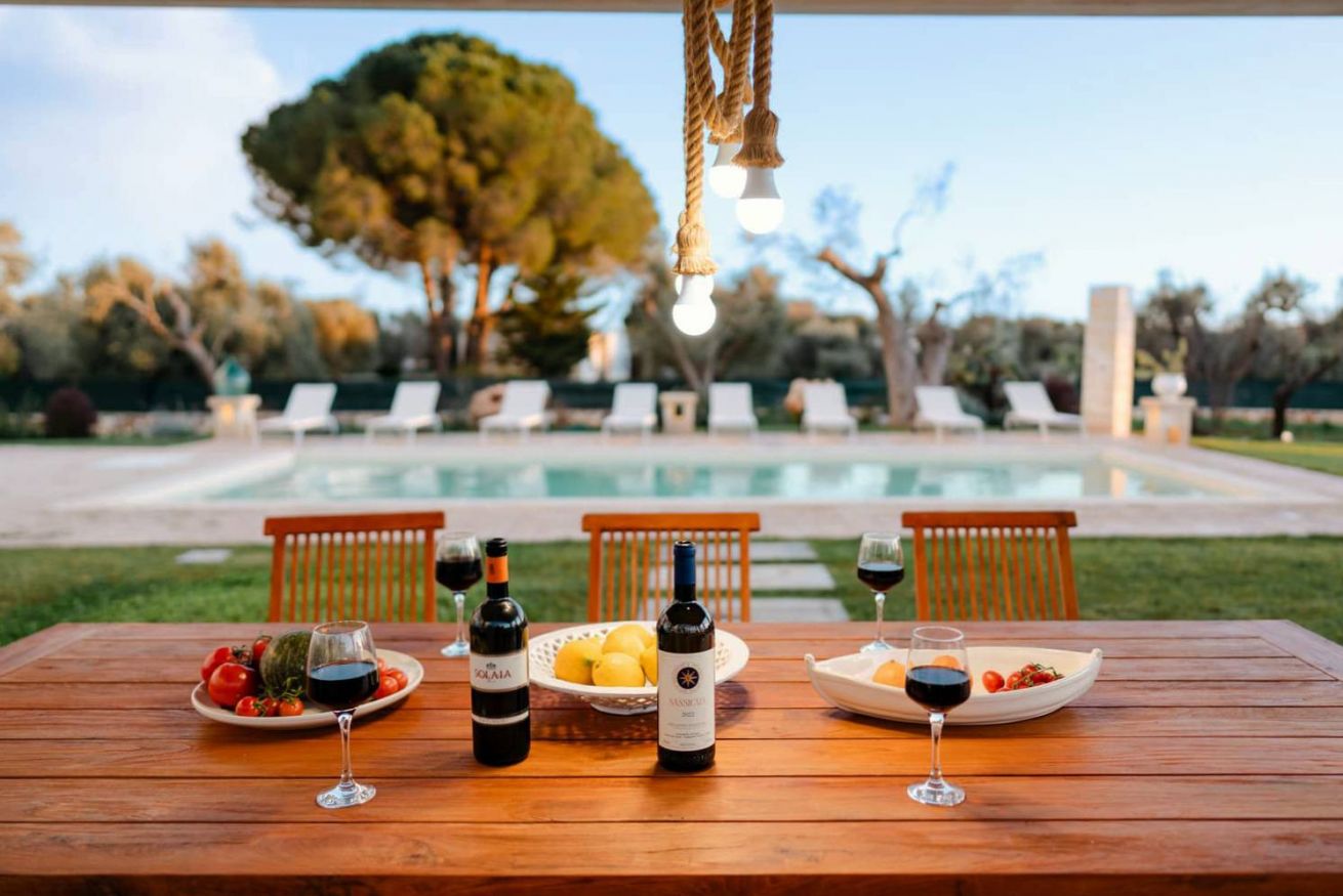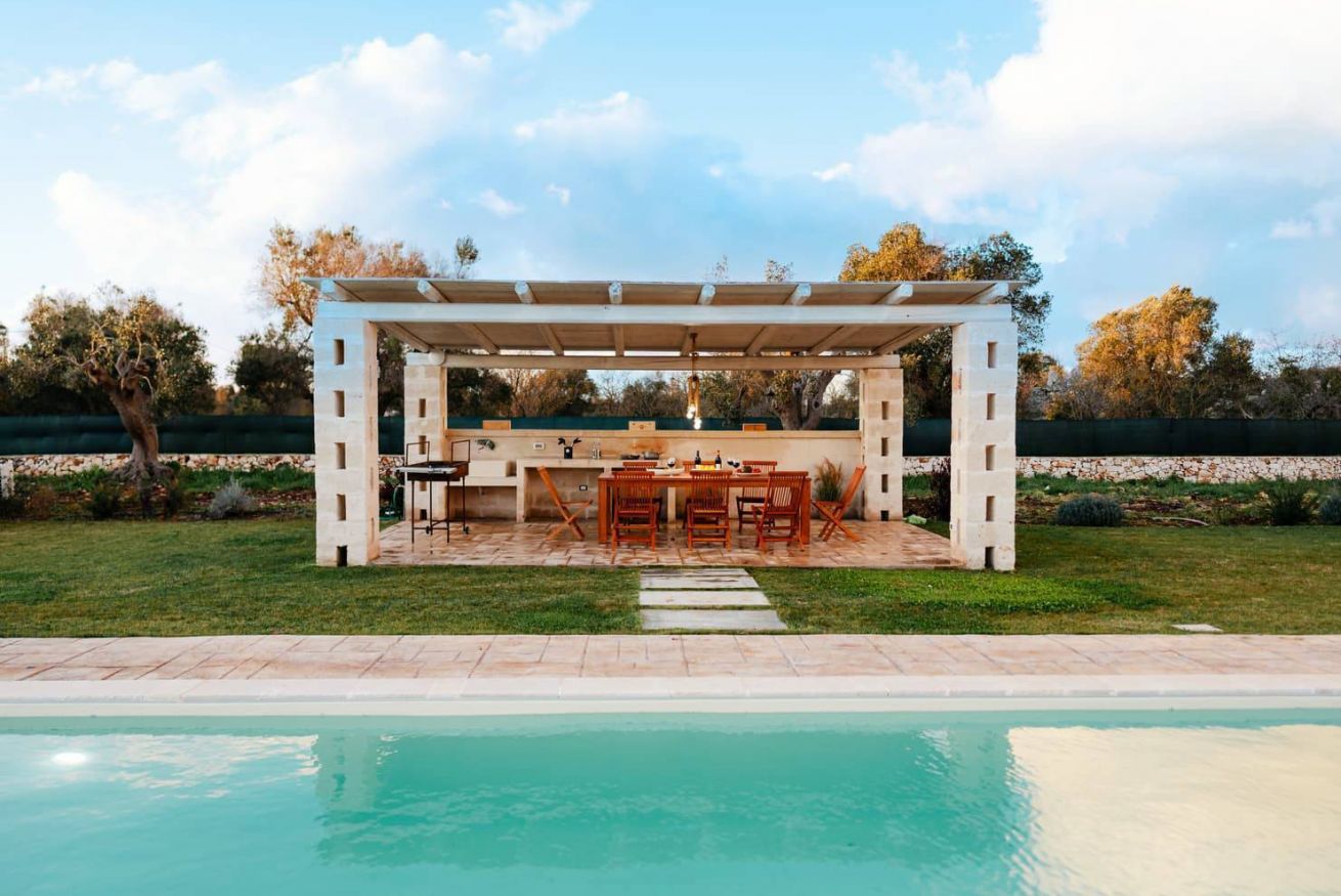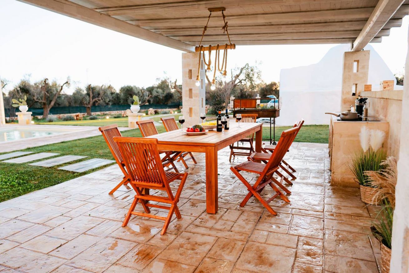 A pochi passi si estende l’area piscina, circondata da grandi spazi esterni perfettamente attrezzati per vivere le giornate all’aria aperta: terrazza arredata, cucina esterna completa di piano cottura, barbecue e lavello in pietra, oltre a un orto di erbe aromatiche. In giardino è presente anche una zona lavanderia con lavatrice e asciugatrice. La posizione garantisce la quiete della campagna con la comodità della costa e dei principali borghi storici facilmente raggiungibili: le spiagge di Torre Guaceto, Ostuni, Cisternino e Alberobello sono a breve distanza.