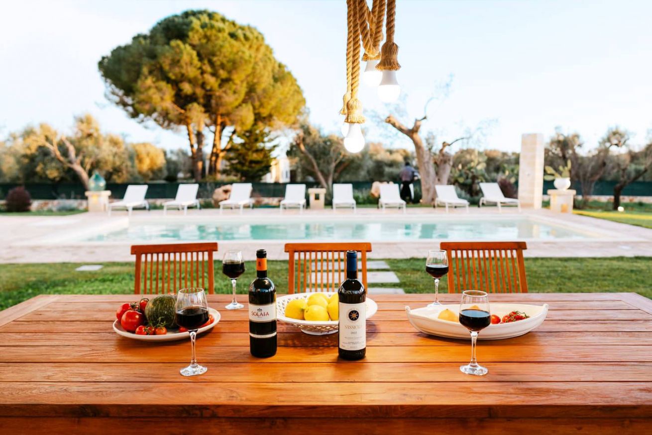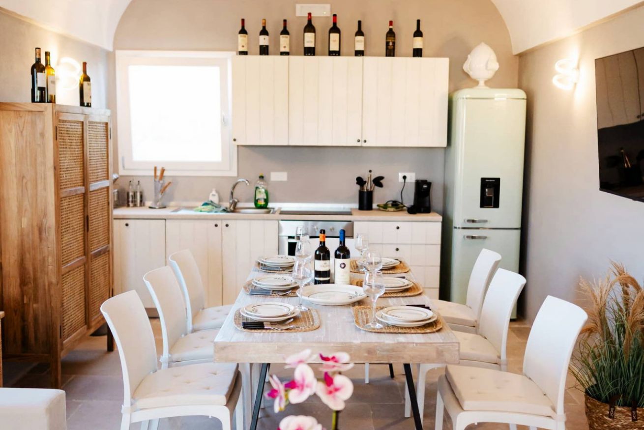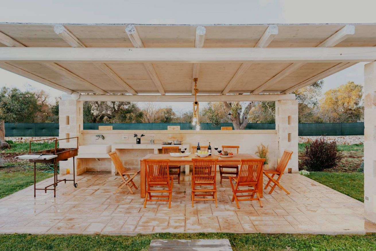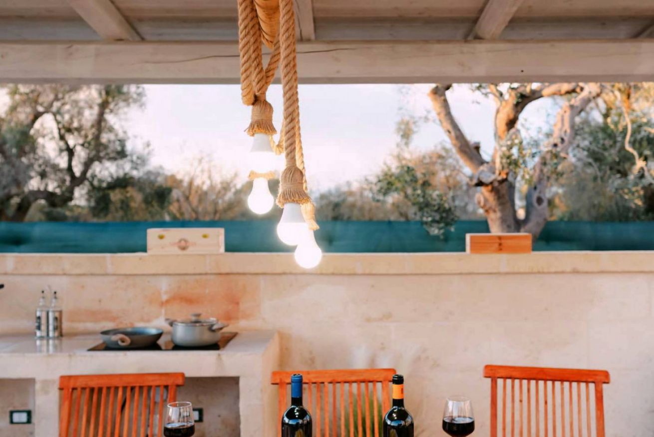 A pochi passi si estende l’area piscina, circondata da grandi spazi esterni perfettamente attrezzati per vivere le giornate all’aria aperta: terrazza arredata, cucina esterna completa di piano cottura, barbecue e lavello in pietra, oltre a un orto di erbe aromatiche. In giardino è presente anche una zona lavanderia con lavatrice e asciugatrice. La posizione garantisce la quiete della campagna con la comodità della costa e dei principali borghi storici facilmente raggiungibili: le spiagge di Torre Guaceto, Ostuni, Cisternino e Alberobello sono a breve distanza.