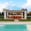 Area piscina con ampio patio, tavolo da pranzo, cucina esterna con piano cottura, lavello in pietra e barbecue. Orto di erbe aromatiche e lavanderia con lavatrice e asciugatrice.